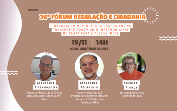 Com o tema “Cidadania em Movimento: A Gratuidade no Transporte Rodoviário Intermunicipal no Ceará para a Pessoa Idosa”, a Agência Reguladora do Estado do Ceará (Arce) promoverá, no dia 19 de novembro, a 36ª edição do Fórum Regulação e Cidadania. O encontro acontecerá a partir das 14 horas, no auditório da Agência, e pretende fomentar o debate sobre o direito ao transporte gratuito e as políticas públicas voltadas à promoção da cidadania da população idosa cearense.