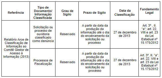 Em atendimento ao disposto no art. 29 da Lei 15.175 de 28 de junho de 2012, o Comitê Setorial da Casa Civil, apresenta o rol de documentos classificados com grau de sigilo e rol de informações desclassificadas: